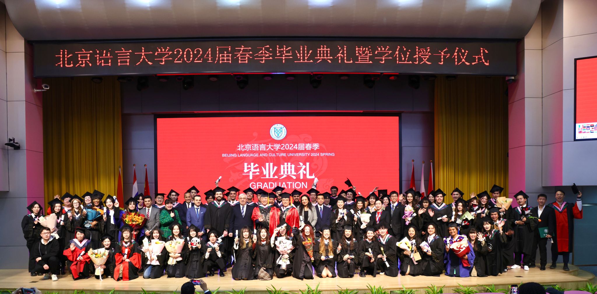 关于表彰2024届优秀毕业生的决定》;外交使节代表土耳其驻华大使伊斯梅尔·穆萨(Ismail Hakki Musa)先生、泰王国驻华大使馆公使衔参赞钟鑫(Pornsiri Charoenserbsakul)女士等莅临典礼现场并致辞;美国西密歇根大学校长爱德华・孟戈睿教授、意大利圣心孔子学院意方院长竺易安教授等作为合作高校及教育机构代表,为毕业生们送上了祝福和寄语。来自突尼斯、韩国、日本、美国等几十个国家和地区的几百名毕业生及其亲友、正妹av