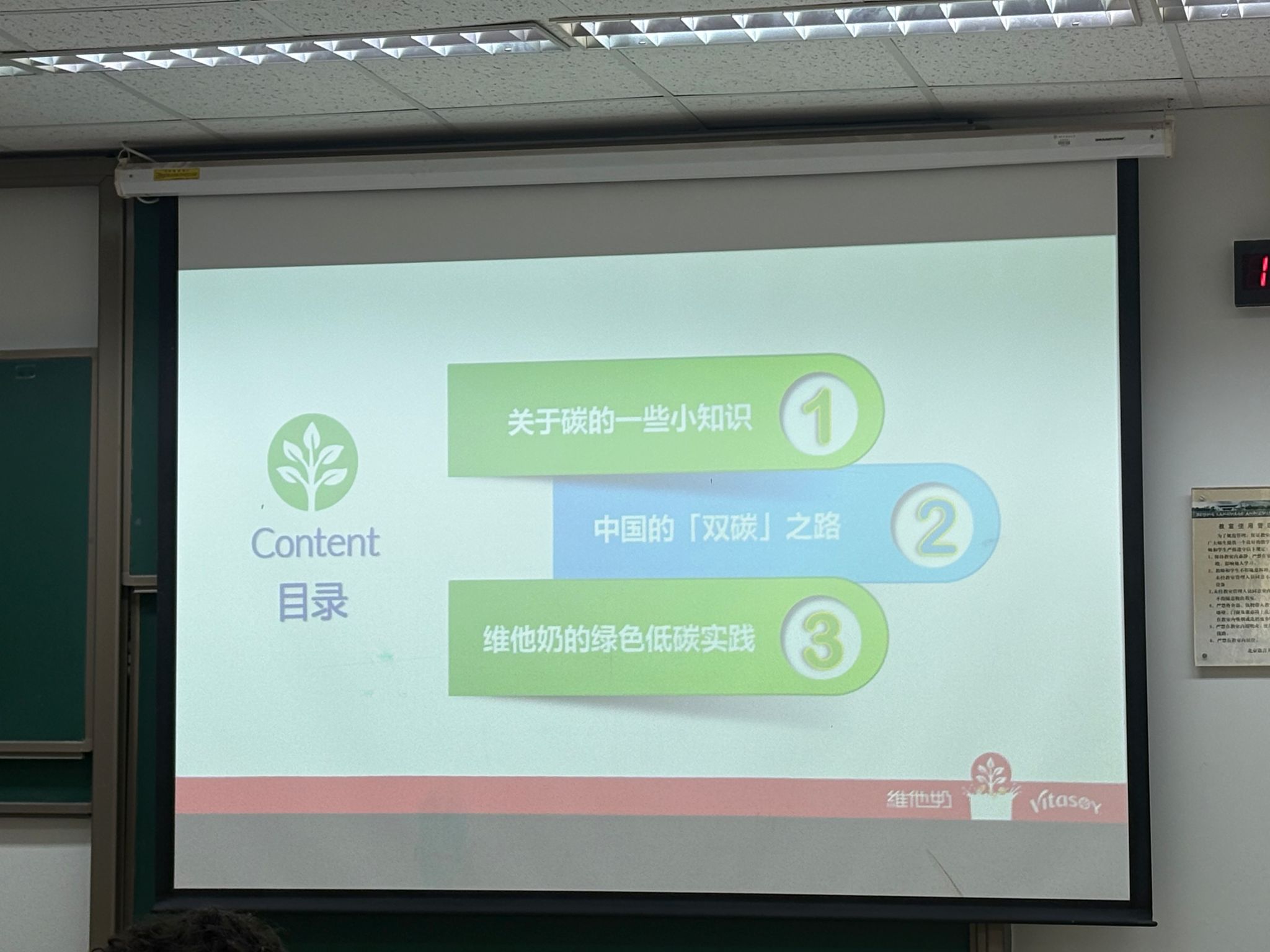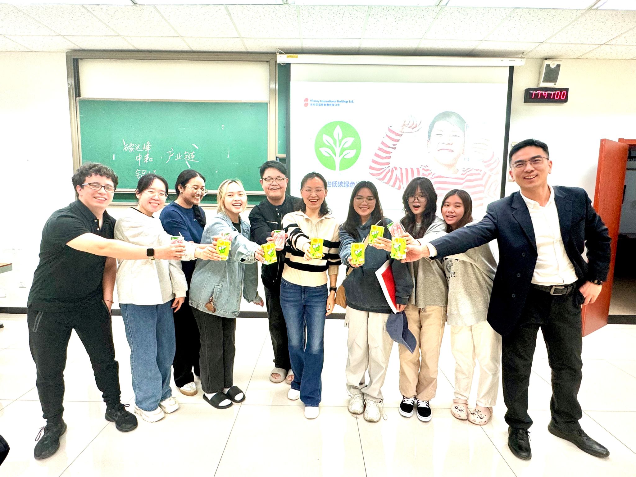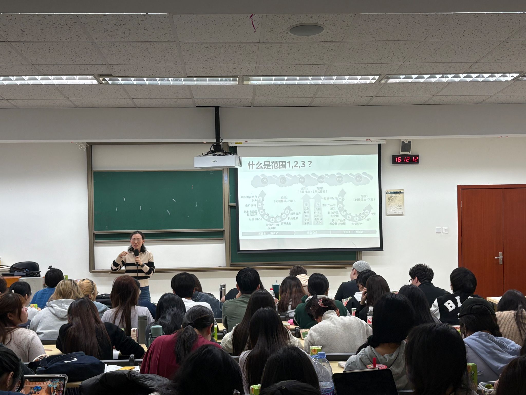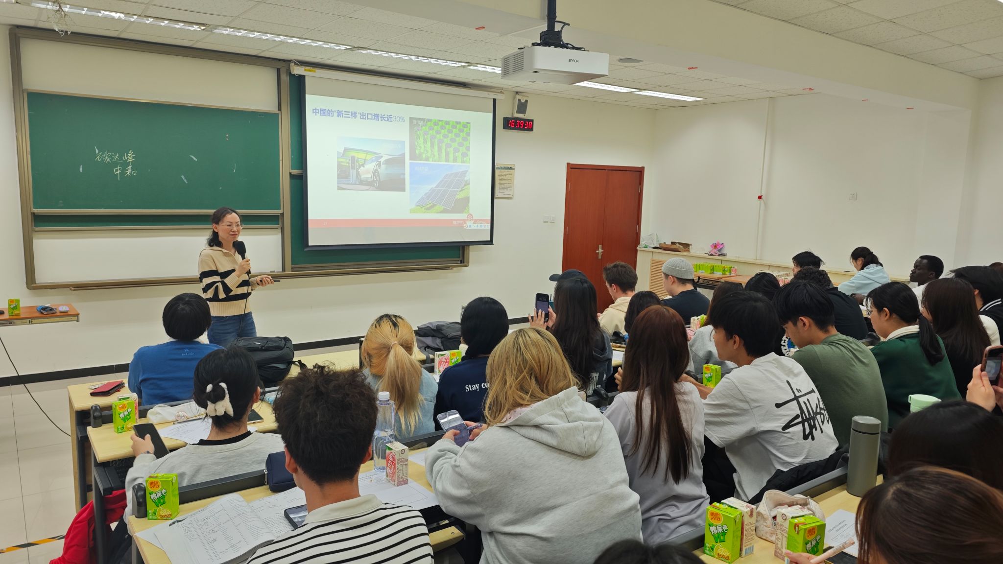 讲座的核心内容聚焦中国企业的实践智慧。古陶女士结合维他奶的“全生命周期管理”体系,展示了植物基产业从研发创新到包装再生的闭环模式:纸基包装经过多道工序转化为乒乓球拍等再生产品,年度减排目标与联合国SDGs深度契合。她还提到中国“新三样”出口激增约30%,指出国际学生们在中文课堂中所学的“新能源电车、锂电池、光伏产品”正是绿色经济的国际通行证。