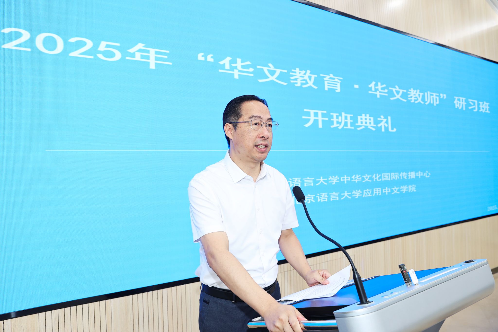开班式上,黄益方副校长发表致辞,向海外华文教育工作者致以热烈欢迎和真挚祝福,并向北京市侨办对学校华文教育事业的关心支持表示衷心感谢。他指出,海外华文教育是中华民族在海外的“留根工程”、“希望工程”,是薪传民族文化、促进海外侨胞与祖国的情感联系的关键环节,当今世界正经历百年未有之大变局,华文教育面临着广阔的发展前景,需要华文教育不断自我革新,适应时代发展要求,提升国际传播能力和影响力。黄益方副校长期待学员们在本次研习活动中乐学善思、在未来的工作中笃行日新,立足五千多年中华文明,依托中国发展的生动实践,全面阐述中国的文明观、发展观和世界观,帮助世界各国人民了解一个真实、立体、全面的中国,深化文明交流互鉴,携手书写海外华文教育事业新的辉煌篇章。