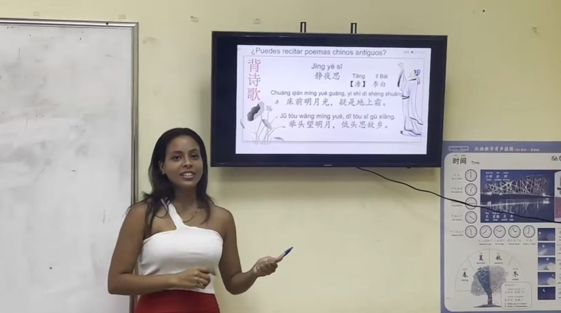 团队成员翟淑芳精心准备了一堂生动的中华诗词课程。学生们通过学习《咏鹅》、《相思》、《静夜思》等经典作品,感受到了诗词中生动有趣的意象和丰富的情感,对中国诗词文化留下了深刻的印象。大家一起诵读,体验了诗词独有的韵律之美。课程结束后,实践团队还组织了诗词游戏活动,如“投壶赋诗”、“曲水流觞”等,尽管条件有限,但活动规则的简化并未影响古巴学生从诗词中获得的快乐。这些活动不仅提高了他们对诗歌的掌握能力,也为诗词课堂增添了更多的活力。