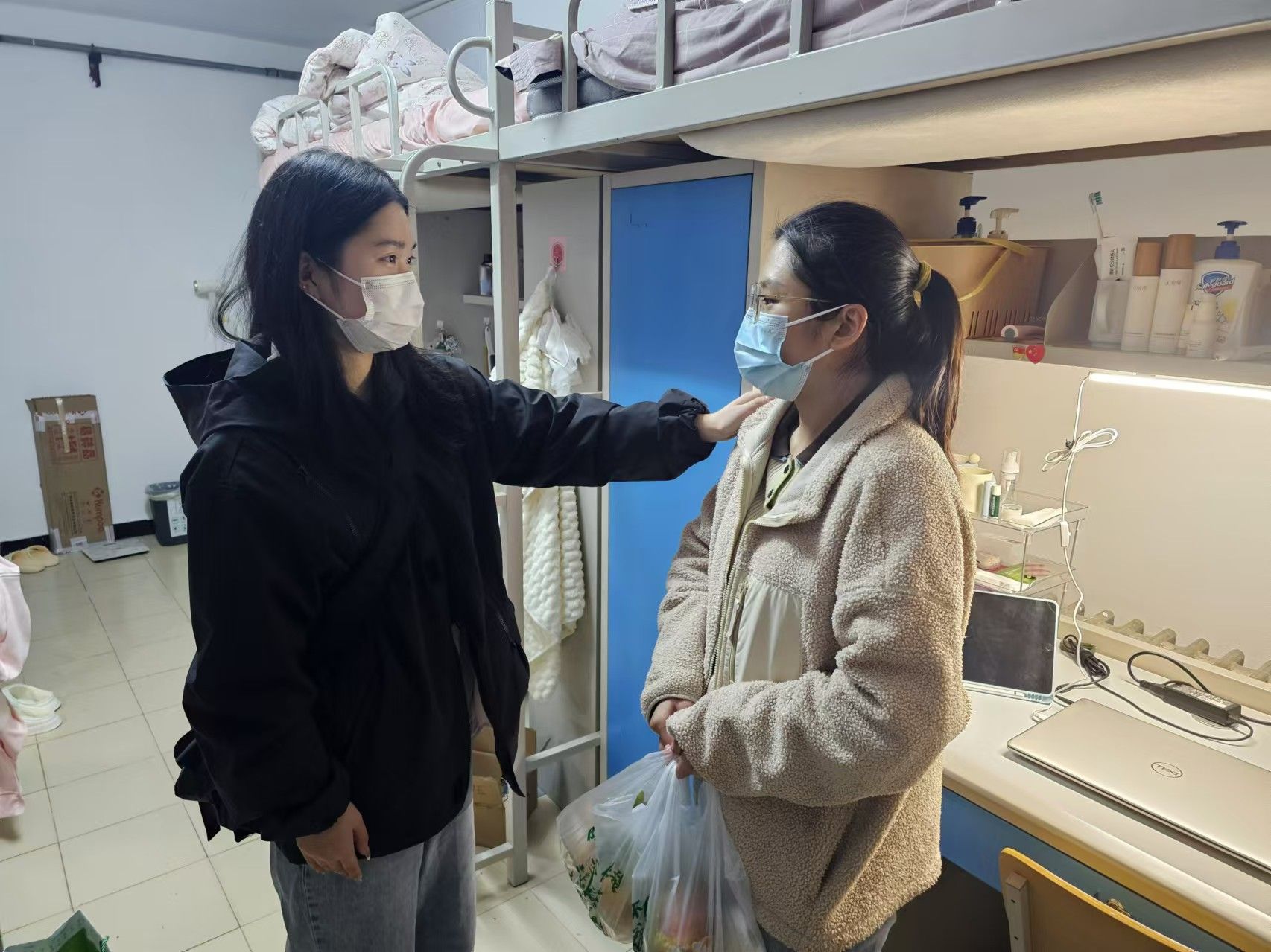 12月初,研三的学生党员田晓妍同学因感冒发烧而不得不卧病在床,这不仅影响了她的正常学习安排,还耽误了求职考试的关键准备期,导致情绪低落。得知这一情况后,学院党委副书记白浩老师亲自联系她询问病情,并鼓励她调整心态、安心养病。同时,白老师还嘱咐党支部书记张菊萍前往宿舍探望,以了解具体情况。当天下午,张菊萍便带着水果及有助于缓解症状的药品来到了田晓妍的宿舍进行慰问。这次探访极大地鼓舞了田晓妍的精神状态,让她逐渐恢复了健康,并积极投身到求职备考中。