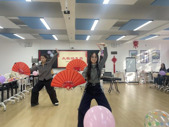 活动伊始,在冯继萱和朴善花同学的主持声中,精彩节目轮番上演。邓嘉欣、魏筱雨、余巧苓同学的太极功夫扇表演,展现了传统武术的魅力。
