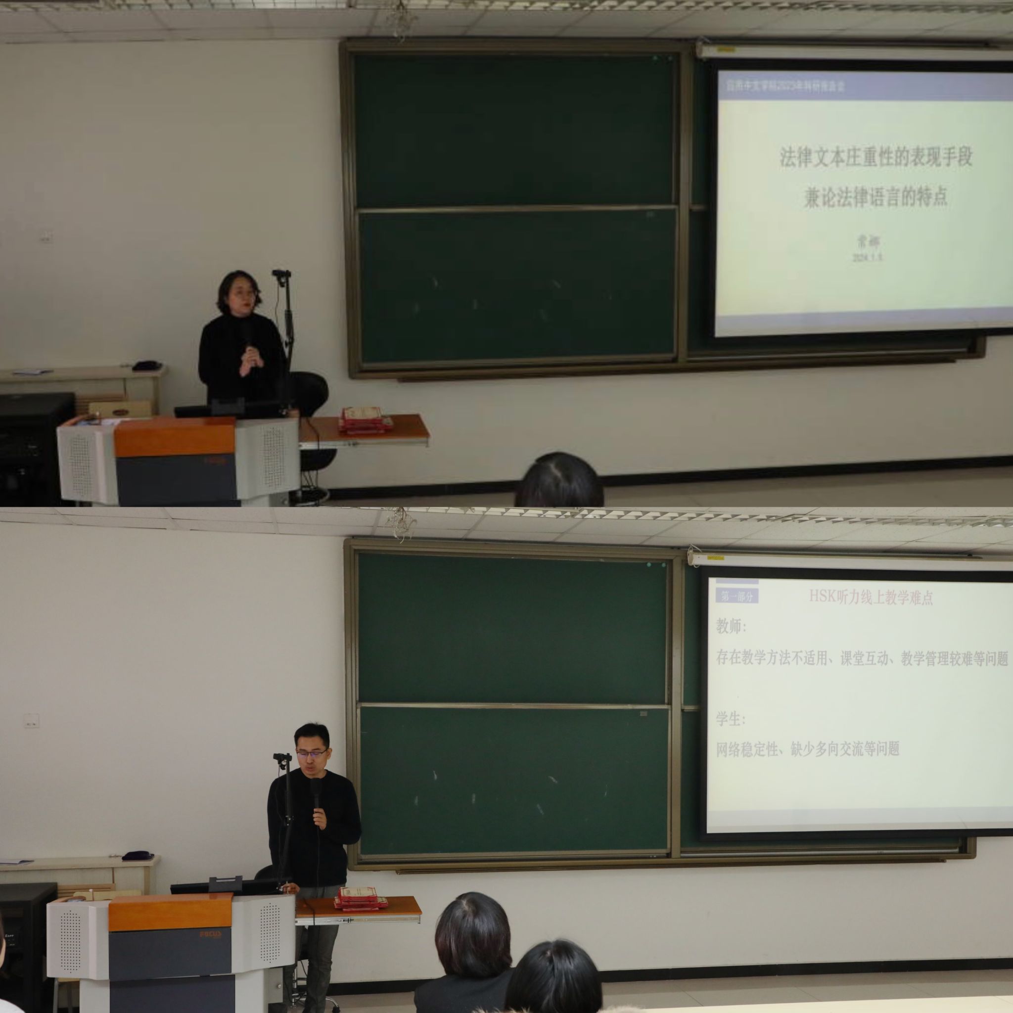 院长、院学术委员会主任苏英霞教授对此次科研报告会的总体工作进行了总结。常娜老师和管延增老师分别做了大会主旨报告。常娜老师的报告《法律文本庄重性的表现手段兼论法律语言的特点》,从词汇选用、句式选择及语篇衔接与布局三方面梳理了法律语言庄重性的主要表现手段,对“法律中文”教材编写和教学有极大的参考价值。管延增老师的报告题为《基于共现网络的HSK听力词汇教学模式构建——以HSK四级听力考试为例》,论文构建了基于词汇共现网络的HSK听力词汇教学模式,对提升HSK教学效果富有实践意义。