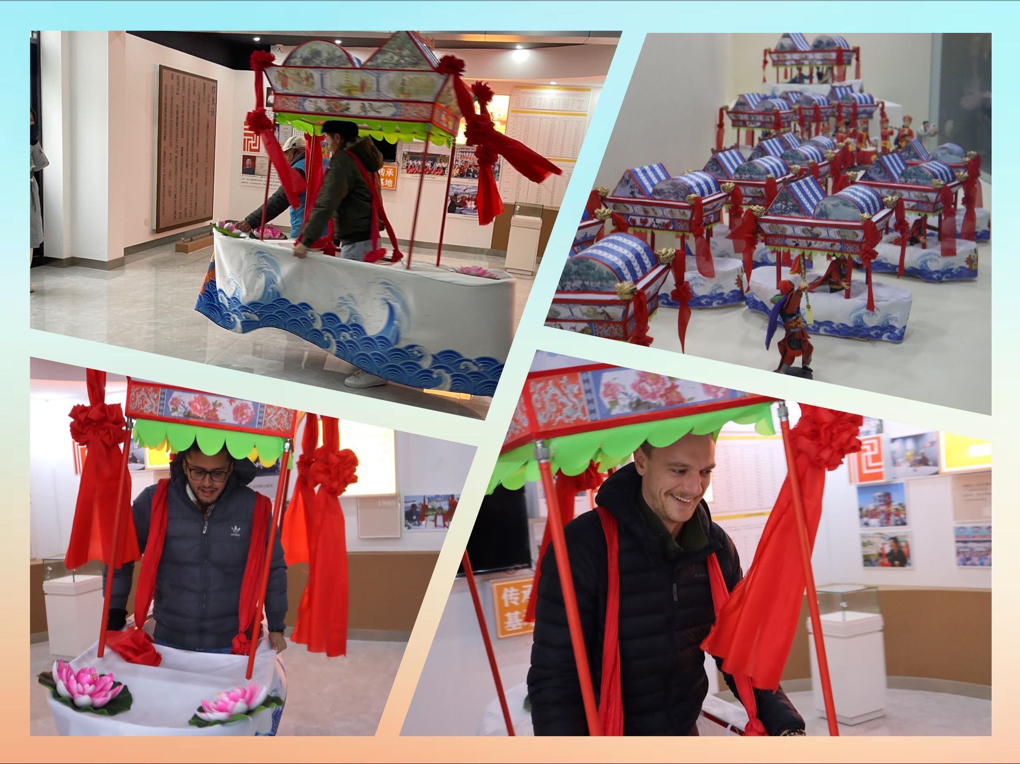 最后,同学们还参观了柳沟乡情陈列室和延庆旱船博物馆,听志愿者介绍了柳沟的历史沿革和风土人情,并了解了延庆旱船的历史渊源,体验了北方的旱船文化。同学们听志愿者介绍,得知延庆旱船在2014年入选国家级非物质文化遗产名录,至今有五百余年的历史,是中国汉民族的一种重要民间舞蹈形式。来自不同国家的同学们忍不住跃跃欲试,来一次中国旱船初体验。
